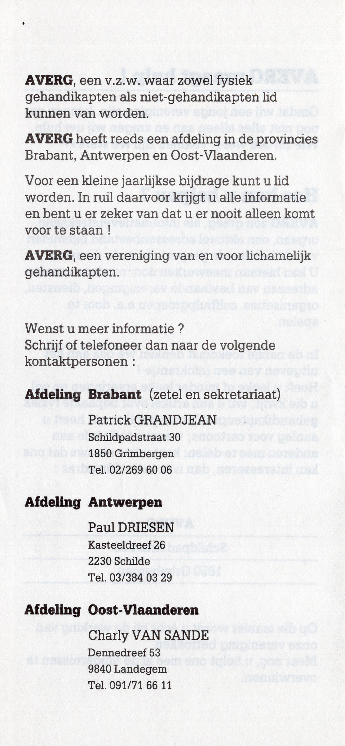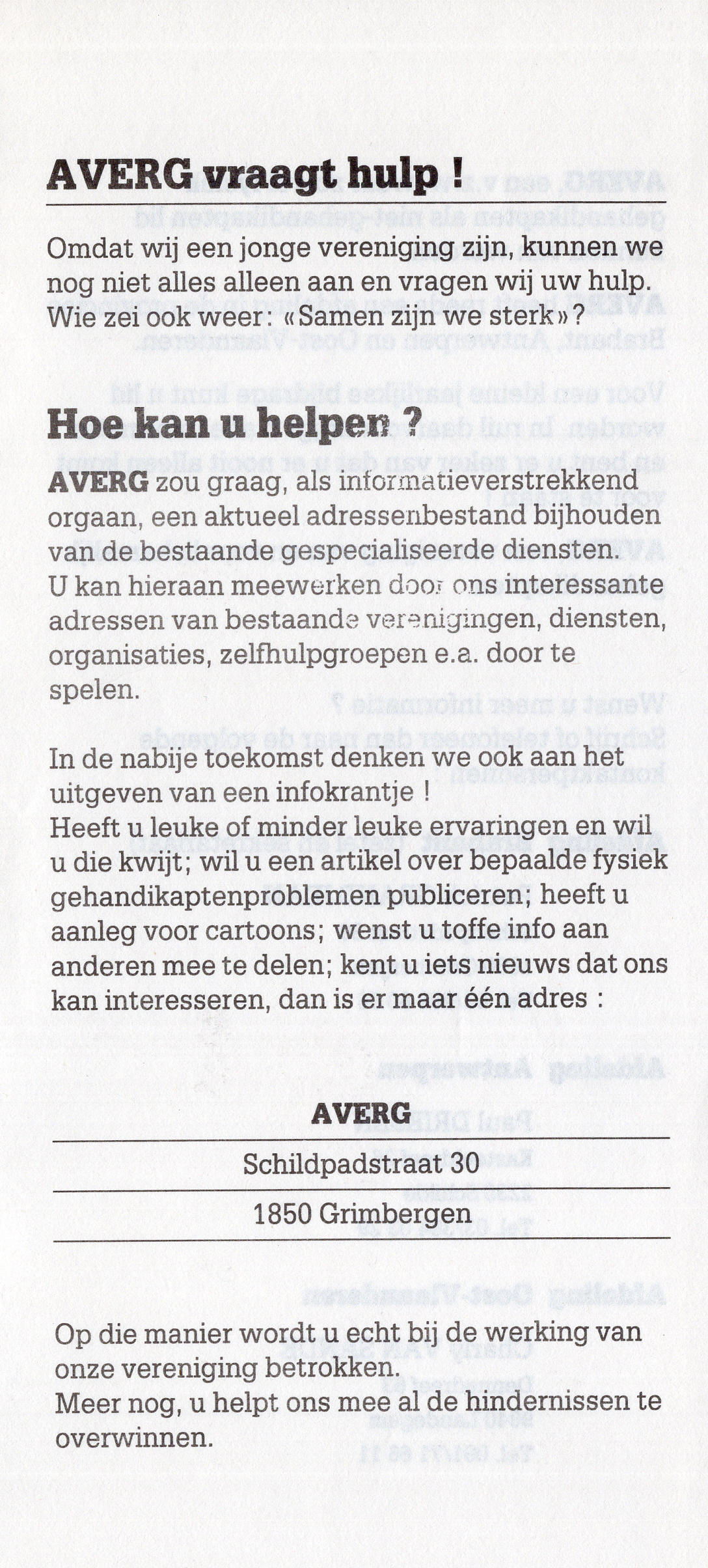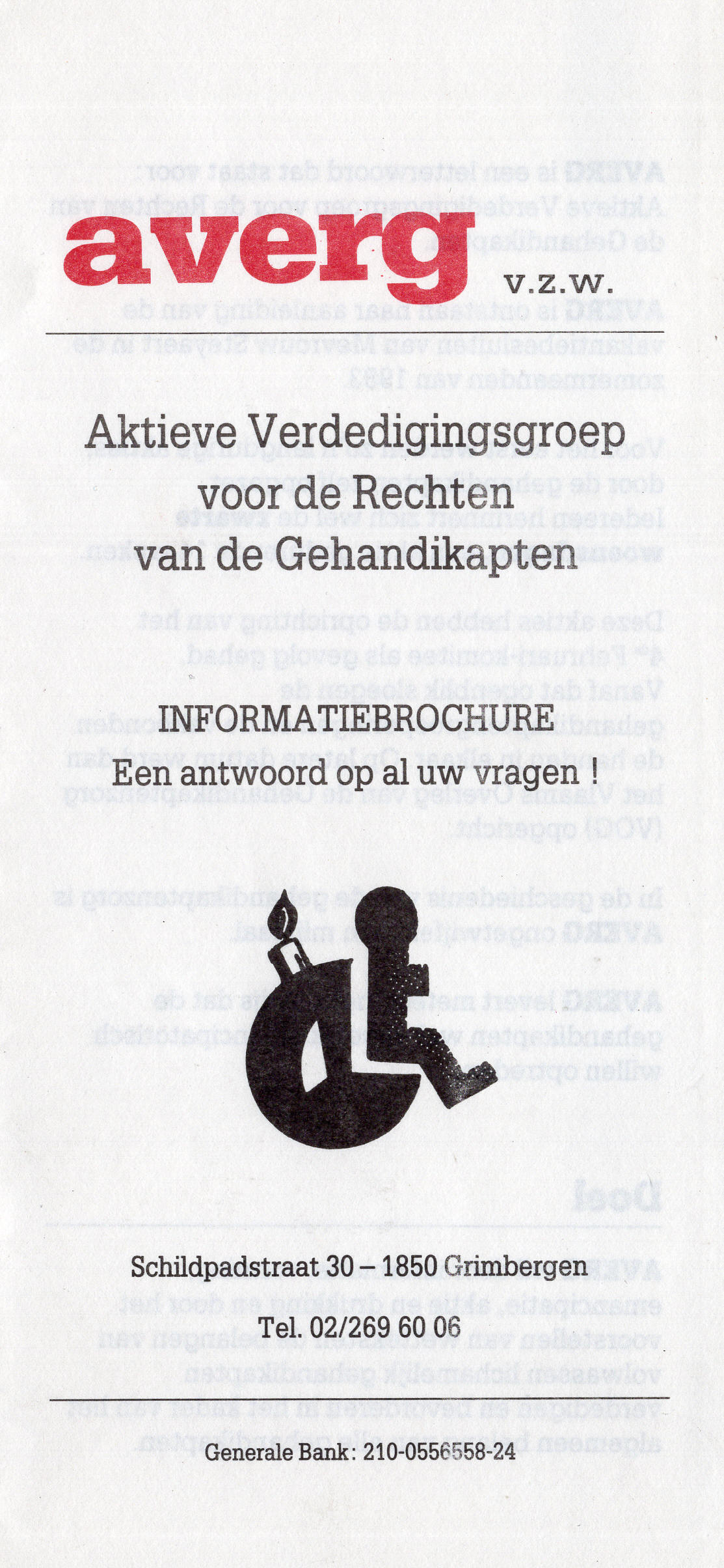 De volle steun van het personeel van voorzieningen aan deze acties en betogingen zorgde ervoor dat later de gehandicapten ook hun steun gaven aan de opbouw en acties van de witte woede met waarborg van de minimumdienstverlening in langdurige stakingsacties. De opbouw van de actieve verdediging van het belang en de rechten van de gehandicapten, met steun van het personeel van vzw Eigen Thuis Grimbergen, was daarbij ook de emanatie van een consequente strijd voor het belang van personeel en gebruikers dat vastgelegd werd in de beleidsverklaring door bewoners en personeel en werd goedgekeurd door de beheerraad in november 1982. Deze beleidsvorm was de eerste maal, en misschien de enige keer, dat in een voorziening/onderneming/bedrijf bewoners en gebruikers beslissingen op elk werkingsniveau konden bepalen, zowel wat de dienstverlening betrof, de aanwerving en het ontslag van personeel als investeringsbeleid. In een bredere historische context was het een realisatie van het voorstelmanifest van de KWB, zoals het in het Rode Boekje van de KWB werd geformuleerd, zie www.rodeboekjekwb.be. In feite waren de acties van 1983 ook het begin van de opbouw en totstandkoming van de Witte Woede, zie de site in opbouw dewittewoede.be. Hieronder de brochure waarmee de AVERG haar acties ondersteunde, oa met contactpunten in diverse provincies. Het is vooral Patrick Grandjean, overleden in 2023, die de drijvende kracht was achter de AVERG, samen met Paul Driesen (Schilde) en Charly Van Sande (Landegem). De later ontstane Verdedigingsgroep Terugbetaling Rolstoelen (Sep Couberghs), de Protestgroep Delizee, het Gehandicaptenfront (KVG, Eigen Thuis en VFG) en het Gehandicapten Liberation Front zijn in het spoor van AVERG tot stand gekomen en hebben telkens verschillende voorzieningen voor zwaar fysiek gehandicapten weten te mobiliseren. Tot de officiële gehandicaptenverenigingen het welletjes vonden en langs door de overheid betoelaagde 'belangenorganisaties' zoals de GRIP, het overheidsbeleid altijd lieten primeren. Het gevolg is ondermeer het 'liberaliseren' van de betoelaging langs het persoonsvolgend budget, het alsmaar langer worden van de wachtlijsten en het ontbreken van een structurele organisatie voor en betoelaging van aangepast vervoer van deur tot deur. Langs deze website wordt de historische eer gegeven aan zij die de lijnen voor de toekomst hebben uitgetekend.