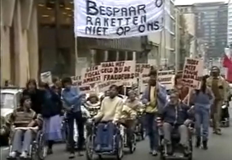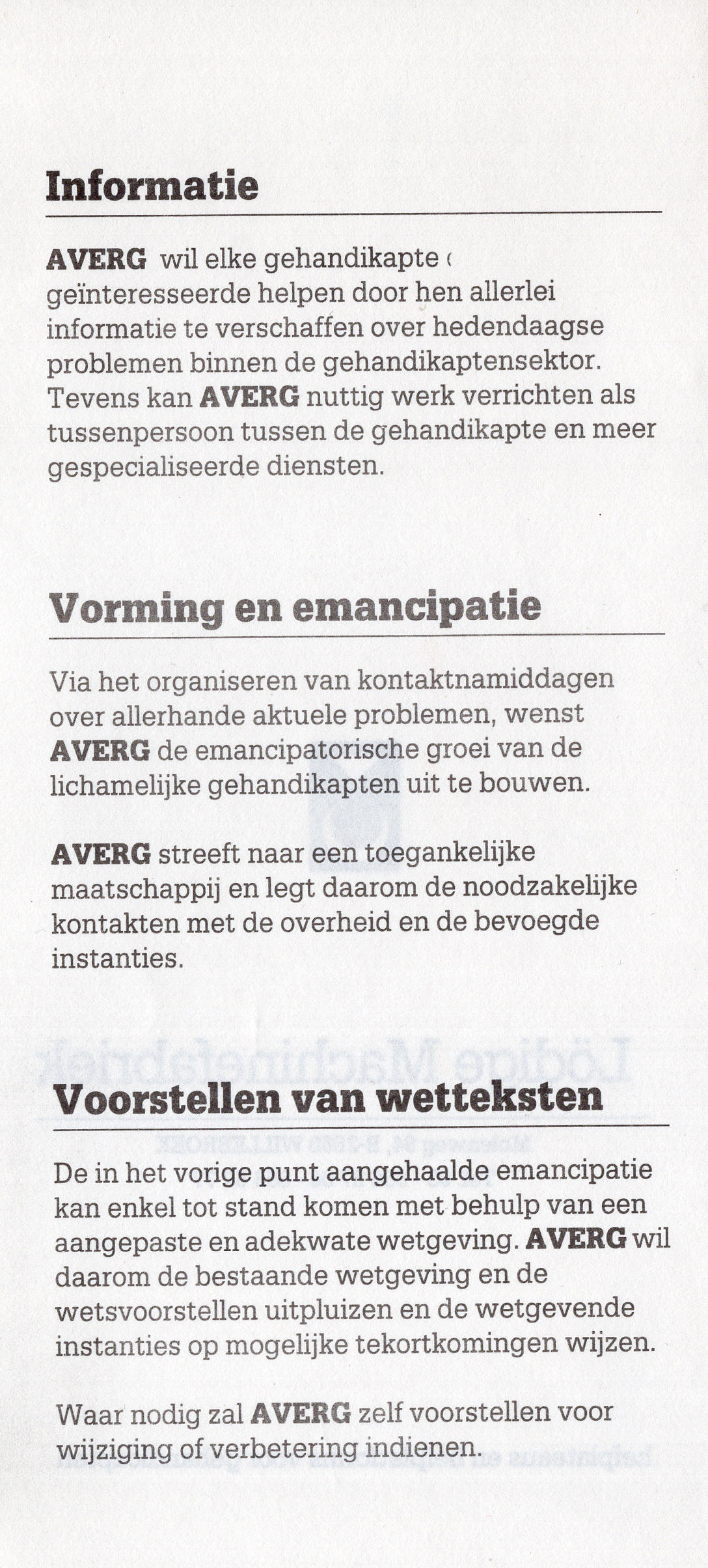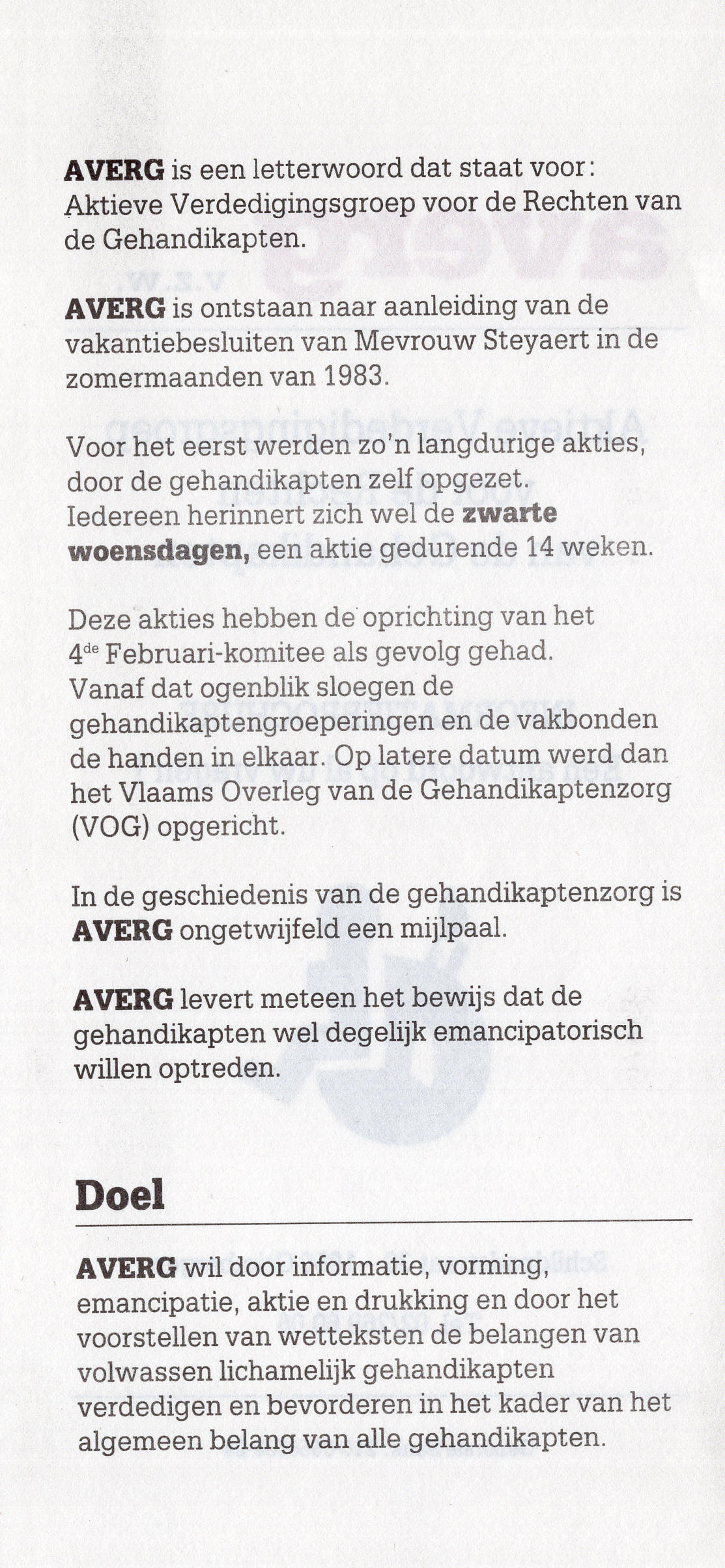 INTRO: De AVERG is ontstaan in 1983 als reactie tegen de maatregelen Steyaert, toenmalig minister van Welzijn, die de bijdrage van de gehandicapten voor hun leefkosten fors verhoogde en de terugbetaling van rolstoelen en apotheekkosten decimeerde. Verschillende betogingen van het Sint-Joost-plein oa naar de Tweekerkenstraat (CVP) resulteerden in november 1983 in een betoging van gehandicapten uit verschillende voorzieningen die wist binnen te dringen in het gebouw waar op dat ogenblik de Vlaamse regering olv minister-president Gaston Geens in vergadering was. De gehandicapten bezetten de inkomhal en dwongen de minister-president en de bevoegde minister om hun vergadering te verlaten en te luisteren naar de eisen van de gehandicapten. Zij beloofden wijzigingen aan het decreet die er uiteindelijk ook gekomen zijn. De terugbetaling van rolstoelen en apotheekkosten werd opnieuw verzekerd en er werd een 'socio-culturele toelage' toegekend die de bijdrageverhoging praktisch volledig compenseerde. Zie de betoging en de bezetting van het regeringsgebouw in de Jozef II-straat in Brussel langs de link hieronder. Het is de eerste betoging van gehandicapten in Europa en allicht de enige die er in slaagde de inkomhal te bezetten en een regering in vergadering te onderbreken.