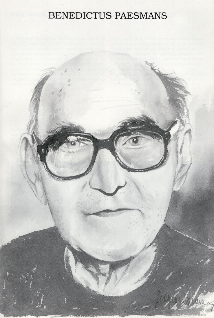 Benedictus Paesmans, Interview Jean Vrijsen Colofon Gezet in Bookman 10 Omslag en portrettekeningen : G. Daemen. Foto's : portretten : R. Dalemans, uit de archieven van R. Vanstreels, R. Nulens en de geïntervlewden ISBN 90-5232-018-7 D/1989/5319/13 - NUGI 480 - * Inhoud ... Een leven in dienst van de kansarmen Professor Benedictus Paesmans, een begrip in Hasselt, maar ook ver daarbuiten. Hij bracht immers als leraar in het Sint-Jozefscollege duizenden jongeren de geheimen van de natuurkunde bij. Maar daarnaast was hij ook een van de pioniers in de armen- en verslaafdenzorg in Limburg, in Vlaanderen. Via Caritas opende hij de ogen van jonge mensen voor de armoede, de ellende van de minstbedeelden. Daarom ook richtte hij Broederhulp op en na de oorlog het Marialegioen. Maar boven alles zal zijn naam verbonden blijven met de AA-beweging in Limburg. Zijn strijd tegen het alcoholisme liep uit op ontelbare initiatieven en realisaties, waarvan nu nog vele getuigen achterblijven : het Volkstehuis, het Consultatiebureau voor Alcoholisme, de Limburgse School voorJ eugd- en Volksmuziek, enz.. Kortom, een groot man, die - in het spoor van zijn heeroom - zijn hart verpandde aan de jeugd en de kansarmen.