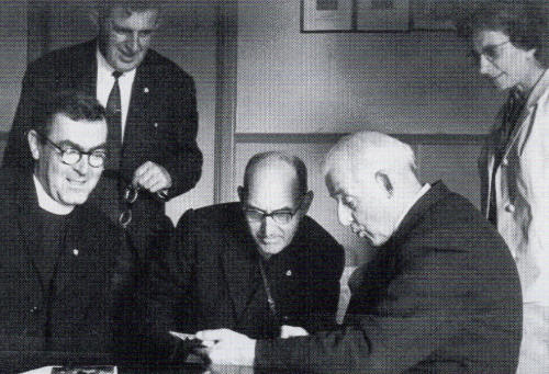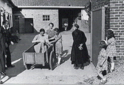 De kostprijs voor heel het pand, dat aardig onderkomenwas, bedroeg 3,3 miljoen. En wij hadden praktisch niets ! Toch hebben wij het uiteindelijk onder bepaalde voorwaarden kunnen kopen. Wij zijn dan onmiddellijk begonnen met allerlei opknapwerk. Eerst moesten alle stenen weer terug van de Badderijstraat naar de Kanaalkom gebracht worden. Verder bouwden we er kamertjes voor thuislozen, er kwam een ontspanningszaal, enz.. We gaven er de naam "Volkstehuis* aan, een tehuis waar iedereen bereid was en is mekaar te helpen. Het Volkstehuis kreeg stilaan een stevige reputatie in de stad. Inderdaad. De mensen zeiden vaak: "Als ge zorgen hebt, ga dan maar naar het Volkstehuis, daar zullen ze u wel helpen." En dat is zo gebleven tot op de dag van vandaag. Sommigen vragen mij of het Volkstehuis nog wel nodig is. Ik antwoord dan altijd dat er regelmatig 40 a 45 pensiongasten verblijven en dat zegt genoeg. Toch is het na de oorlog niet altijd even gemakkelijk geweest. Nee, dikwijls moesten we hard knokken om voldoende geld bij mekaar te krijgen om de zaak draaiende te houden. Onze reizen in de jaren '50 en '60 naar Ierland hebben ons wel gesterkt. Daar ontmoetten wij Frank Duff, de stichter en bezieler van het Marialegioen. Dat had als doelstelling de afgedwaalden te bekeren met de hulp van O.-L.-Vrouw. Eenmaal