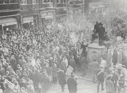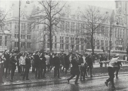 21 december, Leuven. De bisschoppen handhaven in een nieuwe verklaring hun oude standpunt: tot elke prijs moet de eenheid van de Leuvense alma mater worden behouden. De beide afdelingen zullen wel financieel meer armslag krijgen. 22 december, Spanje. Te Barcelona worden 250 studenten voor een jaar van de universiteit gestuurd omwille van hun acties voor de democratisering van de officiële studentenvakbond SEU. 24 december, Leuven. Onder voorzitterschap van de Vlaamse socioloog Edward Leemans en de Waalse fysioloog Xavier Aubert, zal een dozijn professoren, voor de helft uit iedere taalgroep, zich in een commissie over de problemen van de universiteit buigen. Knelpunten zijn de katholiciteit, de herstructurering en de ruimtelijke spreiding. Wat dit laatste punt betreft interpreteren de Vlaamse leden van de commissie Leemans-Aubert de verklaring van de bisschoppen ondanks alles toch als de erkenning van een principiële overheveling van een belangrijk gedeelte van de Franse afdeling. Het Franstalige kamp houdt er echter een andere mening op na. januari Duitsland. Een bom ontploft in een Berlijns studentenhuis waar een discussie over Vietnam aan de gang is. De pers, die in Berlijn voor 80 % gecontroleerd wordt door het Springerconcern, veroordeelt in plaats van de bomaanslag de anti-Amerikaanse houding van de studenten. Het komt tot een eerste Vietnamdemonstratie te Berlijn. Hierop verbiedt de academische senaat alle politieke activiteit binnen de gebouwen van de universiteit. 3000 studenten houden als reactie een sit-in in het senaatsgebouw zelf, waarna de senaat terugkrabbelt en zijn beslissing intrekt. Verenigde Staten. De moord op de zwarte student S. Younge in Alabama leidt tot talrijke studentenmanifestaties tegen racisme. Er komt dit jaar onder de studenten ook steeds meer beroering over de Amerikaanse interventie in Vietnam: teach-ins, sit-ins, volksvergaderingen, betogingen en soms zelfs hongerstakingen volgen elkaar op. Voorts worden zowat 100 'free universities' opgezet in de loop van 1966. En Californië wordt de bakermat van de eerste hippiecommunes. 19 januari, Brussel. Een 200-tal betogende studenten uiten hun ongenoegen over besparingen in het onderwijs. 31 januari, Zwartberg. Wanneer stakende mijnwerkers, die protesteren tegen de sluiting van de mijn van Zwartberg, ook de mijn van Winterslag proberen stil te leggen, schiet de rijkswacht met scherp. Talrijke betogers geraken zwaar gewond en twee mijnwerkers komen om het leven. Dit ernstige incident, waarvoor politiek de socialistische minister van binnenlandse zaken Alfons Vranckx verantwoordelijk gesteld wordt, heeft over het algemeen grote invloed in studentenkringen. De rijkswacht wordt voorgoed het symbool van autoritaire ordehandhaving. februari 1 februari, Leuven. De Vlaams-nationalistische Studentenunie (VNSU) organiseert een betoging met meer dan 1000 studenten tegen de 'moorden' van Zwartberg. 2 februari, Gent. VVS breng 2000 studenten op de been in een betoging voor democratisch onderwijs. 3 februari, Hasselt-Gent. Terwijl in Zwartberg de slachtoffers worden begraven komen in Hasselt en Gent respectievelijk 850 en 650 studenten op straat uit solidariteit met de Limburgse mijnwerkers. 5 feburari, Nederland. Het Amsterdams studentenblad Propria Cures sluit zich aan bij de provobeweging. 15 februari, Brussel. Een 30-tal studenten van de ULB betogen tegen het autoritaire regime van president Salazar in Portugal. 16 februari - 6 mei, Herstal. De vrouwelijke werknemers van de wapenfabriek Herstal staken, tegen de wil van de mannen aldaar in, voor gelijk loon en gelijk werk. Hun lange staking luidt een reeks feministische acties in. DE BURGER SPRINGT UIT DE BAND - Inhoud De maandenlange staking van de vrouwelijke werknemers van Herstal kaderde in een reeks revoltes die tekenend werden voor het politiek gedrag van de aankomende staatsburgers. Het begon met de stakingen tegen de eenheidswet in 1960-1961, gevolgd door de bitsige boerenopstand van 1962 en de Limburgse mijnstaking van 1966. Opmerkelijk was dat telkens het politiek gezag werd ondermijnd. Dit was vrij nieuw en het establishment was dan ook onaangenaam verrast. De staatsburger sprong uit de band. De periode 1945-1960 waren alles wel beschouwd gedweeë jaren van loyaal burgerdom, betutteling en volgzaamheid. Niet dat men niet op straat kwam. De koningskwestie en de schoolstrijd werden ook manifest op straat uitgevochten, maar opvallend is hoe sterk de greep van de politiek elite op de massa bleef.