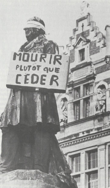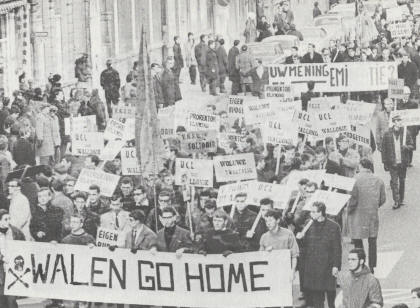 10. Interuniversitaire betoging, onder het motto 'Walen go home', Leuven, 15 december 1965. De slogan 'Prorector Vlaming en leek' staat in verband met de opvolging van mgr. Louis de Raeymaeker die op het einde van het jaar zijn ambt zou neerleggen: kernachtig eisen de studenten daarmee niet enkel de vervlaamsing maar ook de laïcisering van de bestuursorganen, die ze aan de bemoeiingen van de bisschoppen willen onttrekken. 15 december, Hout-Si-Plout. De 'universiteit van Hout-Si-Plout' wordt opgericht. Met tientallen bussen arriveren Franstalige studenten uit Leuven in dit onooglijke dorp in de provincie Luik, waar ze als het ware een nieuwe Waalse universiteit uit de grond stampen. Het lijkt wel een middeleeuVVSe 'secessio'. Overal in het open veld verrijzen benevens allerlei academische instellingen ook overvloedig studentenvoorzieningen. Zo wordt het voor iedereen een mooie dag: terwijl de Waalse studenten een frisse neus halen in Hout-Si-Plout, kunnen te Leuven de Vlamingen ongestoord manifesteren tegen de driehoek van Woitrin en Woitrin zelf ontvangt die dag als eerste een eredoctoraat van de kersverse Waalse universiteit.