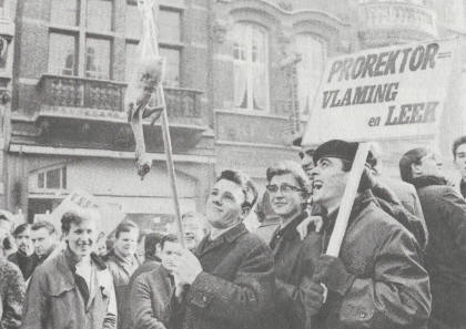 oplossing komt, zullen we deze universiteit afbreken', 's Anderendaags bloklettert La Libre Belgique paniekerig: 'Un seul problème dans l'immédiat: Ie maintien de l'ordre'. 19 januari, Antwerpen - Gent - Kortrijk. De strijd om Leuven Vlaams zorgt niet alleen te Leuven zelf voor de nodige beroering in de studentenwereld. Ook te Antwerpen, Gent en Kortrijk voeren alles bij elkaar zo'n 1500 studenten acties uit solidariteit met hun Leuvense collega's. 21 januari, Leuven. Tijdens de nacht van 20 op 21 januari moet een Waals studentenhuis een molotov-cocktail incasseren. Nog diezelfde nacht wordt een auditorium in brand gestoken. De brandweer is uren bezig eer het vuur helemaal geblust is en de schade zou ruim 1 miljoen frank bedragen. De daders kunnen ontsnappen maar hardnekkige geruchten doen de ronde dat het om een Waalse provocatie gaat. In de loop van de dag vergadert de unitaire raad van beheer van de Leuvense universiteit met de bedoeling de standpunten van de taalgroepen dichter bij elkaar te brengen. Er komt echter geen akkoord uit de bus waarop de VVP haar staking besluit voort te zetten. 22 januari, Leuven. Het Aktiekomitee voor Universitaire Expansie geeft een persconferentie. Het comité protesteert tegen de willekeurige arrestaties en de belemmering van de vrije meningsuiting. Het wetenschapsbeleid van de regering Vanden Boeynants heet een fiasco te zijn en het comité eist bijgevolg het ontslag van de regering, 's Namiddags luidt een volksvergadering een nieuwe woelige week in. De studenten roepen niet langer: 'Goossens vrij!', maar: 'Goossens uit de handen van de fascisten'. Een nieuwe slogan is ook: 'Wij zullen alle bourgeois-universiteiten afbreken en volwaardige democratische universiteiten opbouwen!'. De SVB verspreidt pamfletten met als titel: 'Bourgeois buiten!'. Het derde nummer van Revolte verschijnt, nog 'illegaler' en opruiender dan de vorige edities, met als kop: 'Moet Leuven branden?' Revolte propageert de guerrilla en levert voor wie de daad bij het woord wil voeren praktische richtlijnen voor de aanmaak van brandbommen en molotovcocktails. 23 januari, Leuven - Gent - Antwerpen. Te Leuven betogen zo'n 2000 Vlaamse studenten voor de overheveling. Te Gent telt men er een 3000-tal, terwijl er ook te Antwerpen 2500 studenten opstappen uit solidariteit nadat VVS hiertoe had opgeroepen. De beweging slaat ook over op het middelbaar onderwijs. In vele steden of gemeenten van belang houden scholieren optochten. De strijd wordt bitsiger. Te Leuven gebruiken Vlaamse studenten in universiteitsgebouwen traangas en boterzuur waarmee ze hun Waalse confraters uitroken. In de namiddag neemt prorector Piet De Somer eigenhandig het vierde nummer van Revolte in beslag. Het blad is nu pas echt illegaal. 24 januari, Gent - Antwerpen - Brussel. De solidariteitsacties duren voort. In Gent vallen er bij een studentenbetoging verscheidene gewonden. 24 januari, Leuven, 's Avonds spreken de studentenleiders Pol Raskin, Jef Dauwe, Jan Mondelaers en Guy Polspoel te Heverlee op een meeting namens het Aktiekomitee. Na de vergadering stappen de studenten in stoet op naar Leuven. De rijkswacht leidt 675 personen op. 25 januari, Leuven. In navolging van de Italiaanse revolutionair Antonio Gramsci (Lettere dal carcere) of van onze eigenste Wies Moens met zijn Celbrieven zet in de gevangenis van Vorst Paul Goossens zich aan het schrijven. De Leuvense 'studentenleider' richt een brief vol aansporingen en waarschuwingen aan de studiemakkers op het thuisfront, in een dramatische schriftuur. 25 januari, Nederland. De Studentenvakbeweging van Nijmegen verklaart zich solidair met de strijd van de Leuvense studenten. 26 januari, België. Premier Paul Vanden Boeynants vindt het hoog tijd dat de inrichtende macht van de Leuvense universiteit haar expansieplannen aan de regering voorlegt. 26 januari, Leuven. Ordediensten verrichten huiszoekingen in de lokalen van SVB, FK en KVHV. Het Aktiekomitee Universitaire Expansie ziet hierin eens te meer het bewijs voor de toenemende 'fascisering' van het regime. Tevens wordt er gewag gemaakt van 150 studenten die de vorige nacht door de politie zouden zijn afgeranseld. Die nacht zijn ook bussen vertrokken naar de belangrijkste bedrijven van Vlaanderen. In Gent neemt de politie pamfletten in beslag. Onder de titel 'Waarvoor vechten de studenten te Leuven' beklemtoont het Aktiekomitee in het pamflet dat de universiteiten van Leuven en Brussel elite-universiteiten zijn in dienst van het kapitaal en dat de studenten strijden voor volksuniversiteiten in dienst van de Vlaamse en Waalse arbeiders, waarbij dus aansluiting wordt gezocht. Te Leuven komen die dag 1500 studenten op straat met in hoofdzaak Vlaamse eisen. 27 januari, Leuven. De VVP-afdelingen van Leuven, Gent, Antwerpen en Brussel besluiten hun academische staking te Leuven verder te zetten. Ze eisen op politiek vlak een principiële beslissing in verband met de overheveling tegen 23 februari. 'Mocht dit niet het geval zijn zal de VVP na die datum de meest radicale middelen aanwenden'. 27 januari, Spanje. De academische overheid sluit nu ook de faculteit geneeskunde omwille van ongeregeldheden met studenten. 28 januari, Leuven. De bisschoppen van België vergaderen te Mechelen om zich als inrichtende macht van de katholieke universiteit te beraden over de toekomst van Leuven. Het Aktiekomitee Universitaire Expansie eist het ontslag van de academische overheid omdat ze niet in staat blijkt aan de Vlaamse eisen tegemoet te komen en een echte democratisering tot stand te brengen. 28 januari, Spanje. Bij wet wordt er een geheime politie opgericht aan de universiteit van Madrid. 29 januari, Leuven. In de huizen van de faculteitskringen Politica, Medica, Psychologie en de Vlaams Technische Kring houden de ordediensten huiszoekingen. Een groep studenten vertrekt naar de Limburgse mijnen om aan de mijnwerkers uit te leggen wat er in Leuven gaande is. 29 januari, Gent-Kortrijk. Studenten voeren actie voor 'Leuven Vlaams'. 3