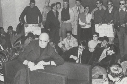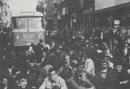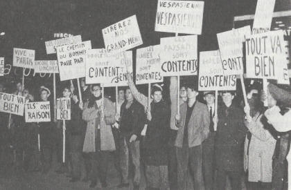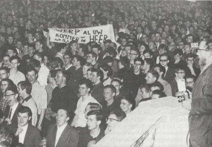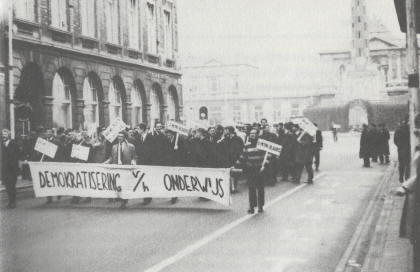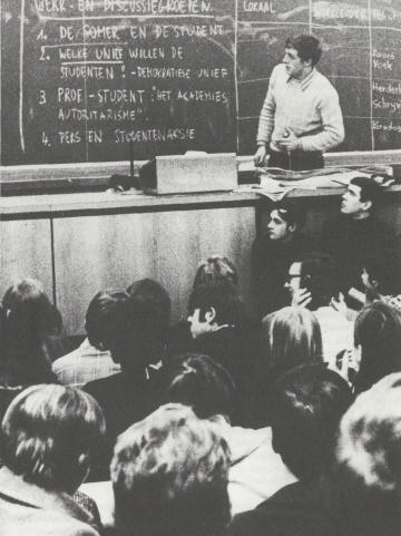 studenten premier Paul vanden Boeynants, die te Leuven een voordracht komt houden over het wetenschapsbeleid, gedurende meer dan een uur het spreken. 20 oktober, Leuven. Vlaamse studenten bezetten de universiteitsbibliotheek. 24 oktober, Leuven. Een kleine groep KVHV-aanhangers komt in verzet tegen de zogenaamde communistische tendens binnen het KVHV-bestuur. Vruchteloos zullen ze proberen een nieuw KVHV van de grond te krijgen. 26 oktober, Frankrijk. Cybernetica-specialist Abraham Moles, hoogleraar in de sociale psychologie in Straatsburg moet zijn inaugurele rede afbreken doordat een tiental studenten hem met tomaten bekogelen. Belangrijker dan het tumult dat hierbij ontstaat is de brochure die bij die gelegenheid door de Straatsburgse studentenkoepel aan de man gebracht wordt: De la misère en milieu étudiant ...et de quelques moyens pour y remédier is zoveel als het handvest van de zogenaamde situationistische internationale. In dit werkstuk wordt een schrijnend beeld opgehangen van de dagdagelijkse leefomstandigheden van de doorsneestudent, waarna een oproep volgt om tegen deze opgedrongen levensstijl te revolteren. De rel van Straatsburg vindt veel weerklank in de Franse studentenwereld, het manifest van de situationisten gaat er van hand tot hand en zal met de daarin vervatte kritiek de strijd tegen de autoritaire en ouderwetse huisreglementen van de studentenwoonblokken aanwakkeren. november Leuven. In Leuven verschijnt HET, een vluchtig gestencild blad, nogal 'provoïd', met literaire aspiraties. 'HET slaapt bij Mao, kakt bij Johnson, eet met Castro en zuipt bij Suenens' HET steekt de draak met 'dominee' Goossens en zijn oktoberrevolutie. 7 november, Gent. Een 20-tal provo's betogen tegen het militarisme naar aanleiding van een legertentoonstelling op het Sint-Pietersplein. 8-9 november, Gent. Na de provo's komen nu ook de Gentse studenten 2 dagen achtereen op straat om te protesteren tegen de legerexpo. Een provo die een rookbom gooit, wordt opgepakt en blijft bepaald lang in voorarrest zitten. Aan de universiteit wordt gestaakt om hem vrij te krijgen. Meteen blijkt hoe geïsoleerd de progressieve studenten nog van de grote massa staan. 16 november, Leuven. Bijna 4000 Vlaamse studenten betogen in de zogenaamde verboden zone, die burgemeester Smets van Leuven heeft uitgetekend. Ze eisen een moderne, zelfstandige Nederlandstalige en democratische universiteit. 18 november, Leuven. Onderhandelingen tussen studenten en academische overheid over medezeggenschap komen moeizaam op gang. Inzet van de besprekingen vormt de studentenvertegenwoordiging in de academische raad en in de faculteitsraden. 7, 14, 21, 28 november, Leuven. De Brusselse hoogleraar en notoire marxist Ernest Mandel geeft een lessencyclus over marxistische economie (in zaal Bellarmino aan het Damiaanplein) te Leuven. De organisatie is in handen van een studiegroep rond het tijdschrift BRUG. 30 november, Leuven. 2000 Vlaamse studenten betogen opnieuw in de 'verboden zone' voor de overheveling van de Franstalige afdeling en voor een democratische universiteit. Woelige betogingen en 'wandelingen' zouden in de komende weken nog voor de nodige deining zorgen. december Gent. Provo-Gent publiceert een brochure over Vietnam, als eerste in de reeks 'Westerse misschaving'.