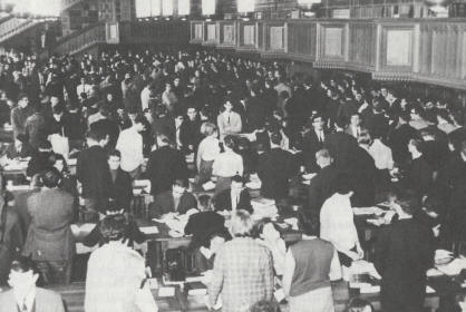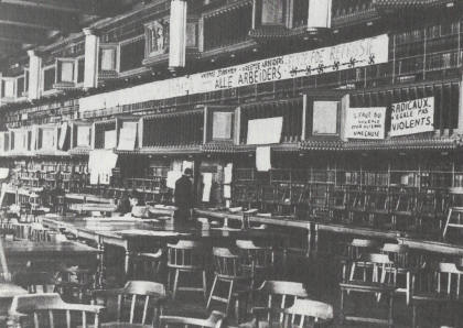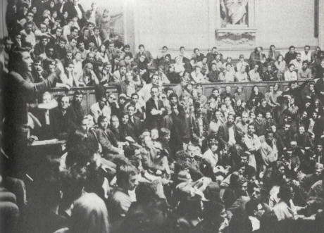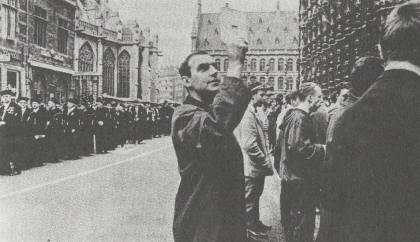 algemene staking en manifestaties over heel Frankrijk aan. De solidariteit tussen studenten en arbeiders lijkt lokaal. 13 mei, Frankrijk. Een hoogtepunt in de Franse studentenagitatie: nagenoeg 1 miljoen manifestanten — arbeiders en studenten — stappen te Parijs in een demonstratie op. Het 10-jarig bewind van generaal De Gaulle lijkt te wankelen. Achteraf bezetten de studenten opnieuw de Sorbonne, die ze ter plekke tot kritische universiteit uitroepen. Zowat overal heerst de sfeer van een culturele revolutie en de euforie van de verbeelding aan de macht (Timagination au pouvoir'). 13 mei, Brussel. Als het in Parijs regent... Ook de Brusselse universiteit geraakt nu in de greep van de internationale contestatie. ULB-studenten ontmoeten studentenleiders uit Parijs, Rome, Turijn, Berlijn en Amsterdam, 's Middags vindt er een informatievergadering plaats in de studentenwoonwijk. Die meeting groeit snel uit tot een heuse 'assemblee libre', een volksvergadering waar studenten spontaan het woord nemen. Alles staat in het teken van de solidariteit met de Parij se studenten. In de loop van de dag komt de zogenaamde 13 meibeweging tot stand: de 'Mouvement de contestation permanente de l'enseignement bourgeois'. Diezelfde avond spreekt de Griekse actrice Melina Mercouri over het verzet tegen het kolonelsregime, tegen de geüniformeerde domheid ('la bêtise en uniforme') zoals minister van staat Henri Rollin het uitdrukt. Vooraf komen de antifascistische organisatoren in botsing met tegenbetogers. Na afloop bezetten 300 a 400 studenten het grote auditorium Paul-Emile Janson, waar in het raam van de nieuwe 13 mei-beweging tot in de vroege uurtjes gedebatteerd wordt over structuur en functie van de universiteit. Omstreeks 3 uur 's morgens wordt deze geïmproviseerde bezetting opgeheven. 14 mei, Frankrijk. Na de faculteitsbezettingen worden nu ook fabrieken bezet. De arbeiders nemen de fakkel van de meibeweging van de studenten over. Dit is voor de regering veel onrustwekkender. De Gaulle vertrekt op staatsbezoek naar Roemenië. 14 mei, Duitsland. In Berlijn, Frankfurt, München en Keulen tonen studenten hun solidariteit met het protest van studenten en arbeiders in Frankrijk. 15 mei, Brussel. Gevolg gevend aan een oproep in muurkranten, wonen meer dan 500 studenten een volksvergadering bij in de grote zaal van de studentenwoonwijk van de Brusselse universiteit. Ze eisen het recht op vergaderlokalen en desnoods het recht om lokalen te bezetten, het recht om vrij affiches aan te plakken, vrijheid van meningsuiting voor alle studenten en de immuniteit van de campus met voor de politie verbod om binnen te dringen in de universiteitsgebouwen. De volksvergadering loopt uit op een betoging. 15 mei, Frankrijk. 2000 a 3000 manifestanten bezetten het Parij se Théatre de l'Odéon. Deze tempel van de burgerlijke cultuur wordt het symbool van de culturele revolutie. De studenten zullen nieuwe stukken creëren en een maand lang gratis voorstellingen geven. 16 mei, Frankrijk. In een tiental steden bezetten arbeiders en studenten bedrijven; onder meer Renault, de grootste Franse fabriek gaat in staking. Het Franse economische leven komt lam te liggen. Op 20 mei zijn al 7 miljoen arbeiders in staking. Ondertussen doen zich voortdurend straatincidenten voor tussen studenten en ordehandhavers. 17 mei, Brussel. Studenten verstoren de opening van de 'Journées médicales' te Brussel. Er treedt een breuk op tussen de harde kern en een groep gematigde studenten: terwijl de enen 'Pouvoir étudiant' scanderen en de Internationale zingen, repliceren de anderen met 'Anarchistes dehors' en 'Evolution: oui, révolution: non'. De praesides van de Brusselse faculteitskringen komen tussenbeide met een communiqué waarin ze op onderwijsvernieuwingen aandringen, eisen, waarachter brede lagen van de studentenbevolking zich kunnen scharen.
