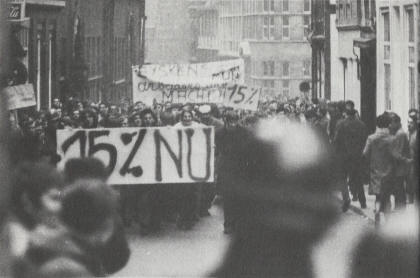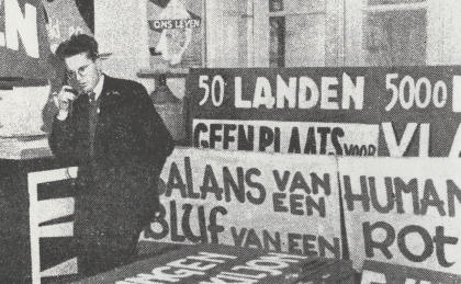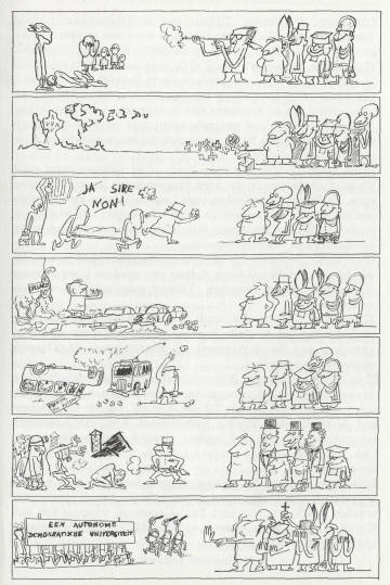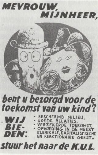 Van de raad van beheer van Universitas krijgt de ... onder de naam Universitas te publiceren. De ontslagen redactie begint dan vanaf oktober 1970 op eigen houtje het blad Omtrend uit te geven, dat een onafhankelijke koers zou varen. De naamverandering deed geen afbreuk aan de kwaliteit van de inhoud. De hele onderneming strandde eind 1975. Omstreeks dezelfde tijd deed zich een gelijkaardig incident voor aan de katholieke universiteit van Nijmegen. Het Nijmeegs Universiteits Blad (NUB) zette daar zijn bestaan op het spel met de publikatie van een als pornografisch gebrandmerkte vertaling van Apollinaire. Na een reorganisatie zou ook het NUB een onafhankelijk blad worden. 12 maart, Antwerpen. De nieuwe statuten van UFSIA verlenen de studenten recht op inspraak en vertegenwoordiging in de officiële organen. De sociale sector mogen ze mee beheren via de sociale commissie. 19 maart, Antwerpen. De Antwerpse studenten geven hun strijd voor een volledig pluralistische universiteit niet op. De Vereniging van Antwerpse Studenten (VAS) organiseert een waarschuwingsstaking en een persconferentie waar zowel UFSIA- als RUCA-studenten hun eisen nogmaals uit de doeken doen. Affiches met de slogan 'Universiteit Antwerpen-NU' bepalen het stadsbeeld. 24 maart, Gent. Tachtig Gentse farmaciestudenten geven in het parlement een petitie af met kritiek op de hervorming van de apothekersstudies. april 20-24 april, Brussel. Een anti-Griekenlandactie zet gedurende een hele week de Brusselse studentenwereld in rep en roer. Het Griekse kolonelsregime voert een terreurbewind met show-processen en foltering van politieke gevangenen als belangrijkste uitwassen. Enkele weken voordien was Griekenland uit de Raad van Europa gestapt en had Athene de Conventie van de Mensenrechten opgezegd. Hiertegen protesteren dagelijks een 500-tal studenten en vooral het gebouw van de Cercle des Nations, waar de Griekse ambassadeur een receptie had gehouden, vormt het mikpunt van hun acties. De rijkswacht komt geregeld tussenbeide om de orde te herstellen wat aanleiding geeft tot rellen. Op 24 april bereikt de actie haar hoogtepunt met een betoging die niet minder dan 2000 studenten op de been brengt. ; 24 april, Leuven. De actie tegen de Griekse kolonels steekt nu ook Leuven aan, waar 2500 studenten manifesteren. 28 april, Leuven. Franstalige studenten, professoren en assistenten, in totaal goed voor een 350 man, eisen nog steeds garanties voor de overheveling van hun afdeling naar Wallonië. 29 april, Antwerpen. Tijdens een topoverleg tussen de regering en de voorzitters van de regeringspartijen over universitaire expansie wordt het plan Kinsbergen goedgekeurd. september 18 september, Brussel. Met het nieuwe academiejaar in het verschiet, raken de studentengemoederen dit keer verhit door een sociale aangelegenheid uit de binnenkeuken: met name het studentenrestaurant heeft tariefverhogingen in het vooruitzicht gesteld. Daar zetten de studenten onmiddellijk de tanden in. De restaurantactie loopt uit tot de maand oktober. oktober 6 oktober, Leuven. In het Comité Studentenvoorzieningen dat de overheidssubsidies beheert die de wet van 3 augustus 1960 voor studentenvoorzieningen heeft bestuurd, komt het tot een breuk. Het comité is paritair samengesteld uit vertegenwoordigers van de academische overheid en van de studenten. Wanneer in oktober 1970 een meerderheid binnen het comité zich uitspreekt voor een gemengde woonvorm in het nieuwe studentenhuis Camilo Torres, trekt de academische overheid haar delegatie terug. De crisis zal een jaar aanslepen. DE STOUTE JAREN IN HET BRAVE LEUVEN - Inhoud 'Er komen andere tijden' zong Boudewijn de Groot Bob Dylan na. Het werd een cliché, dat ons beeld van de jaren zestig soms vervalst. Want zo snel veranderde het ook weer niet, en nog het minst snel — lijkt wel — aan de oppervlakte van het bestaan, in de outfit van het dagdagelijkse leven. In het braafste deel van de Lage Landen drong de tijdsgeest maar met enige vertraging door. Terwijl we inzake maatschappelijke veranderingen en met name van de studentencontestatie zelf, rijkelijk vroeg ons deel kregen, lijken de alledaagse kiekjes van toen bepaald braaf. Met historische myopie geslagen, vertonen we de neiging om de jaren zestig door de bril van de jaren zeventig te bekijken en de verkeerde rekwisieten voor de reconstructie aan te slepen. Paul Goossens, Walter de Bock en Kris Merckx waren nette jongens, keurig gekapt. Hoogstens hadden ze al eens de obligate das voor een contestataire rolkraag ingeruild. Toen Willy Kuypers de rolkraag in het parlement introduceerde, was dat voorpaginanieuws. De geitenwollen sokken, de kabouterbaarden en de vuile bruine kroegen, dat waren al de vroege jaren zeventig. Om van de parka's maar te zwijgen, dit confectie guerrilla-plunje, het uniform van de actievoerder, de 'schutkleur van het progressieve kuddedier'. Dat waren de vroege jaren zeventig, net zoals de anti-design waarmee de koten werden uitgemonsterd: de bierkratten, die hogelijk alternatieve zitmeubels waarin je, als je ze op hun kant zette, ook nog je complete vakbibliotheek en de jeugdschriften van Marx kwijt kon. Ze zijn nu goud waard, die houten bakken van de Stella. En op café lag het cliënteel onder visnetten op groezelige kussens of erger op matrassen. Daar werd nachtenlang gediscussieerd over liefde en revolutie en de misdaden van de Roomse kerk. Toen de Derde Wereldbeweging al aan 't uitwoeden was, verschenen pas in Leuven op grote schaal Che Guevara-posters. Che was het boegbeeld van de internationale solidariteit en een uitdaging aan het adres van pa en ma en de hele santekraam. Che was vooral een romantische archetype, politiek met een overschot aan charisma en een nadrukkelijke sex-appeal. Maar nog eens, dit verhaal wordt eentonig, dit waren niet de jaren zestig. Toen droeg de beursstudent een blauwe blazer en 's winters een duffel-coat, de bekende houtjes-touwtjes jas die uit de jaren vijftig was overgeleverd. Meisjes in lange broek w