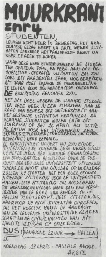 Leuven-Frans aanpakt. Eindeloze discussies vooral met betrekking tot de zware financiële complicaties hadden tot nu toe niets opgeleverd. Naar aanleiding van deze spontane manifestatie komt het tot een echt gevecht met de rijkswacht, die erg kwistig met traangas omspringt en een zestal arrestaties verricht. 11 maart, Leuven. Een groepje van 30 studenten voert op initiatief van VVS actie voor de afschaffing van militaire pacten. De rijkswacht maakt voortijdig een einde aan deze manifestatie. Tegen dit onvriendelijke optreden wordt dan 's avonds betoogd door een 200-tal studenten. 12 maart, Leuven. Naar schatting 2000 Franstalige Leuvense studenten houden een zogenaamde informatie-picknick in het stadspark. Jacques Leroy, studentenafgevaardigde in de academische raad, spoort de studenten aan om de regering uit haar immobilisme wakker te schudden en waarborgen voor de overheveling te eisen. Later op de avond komt het tot schermutselingen met de politie. 12 maart, Luik. De raad van beheer van de Luikse universiteit die bereid lijkt een studentenvertegenwoordiging toe te laten, besluit de hele zaak toch achter gesloten deuren af te handelen, waardoor ze de studenten net tegen zich in het harnas jaagt. 12 maart, Gent. De organistoren van een debat over pornografie krijgen van de academische overheid te horen dat ze op de bewuste avond hoogstens plaatjes met erotische afbeeldingen uit de antieke oudheid mogen projecteren. De bijna 400 belangstellenden zijn woest en lijken niet van plan om zoveel betutteling over hun kant te laten gaan. Onmiddellijk begint een werkgroep pamfletten te stencilen tegen de onhandige censuur van rector Bouckaert. Studenten sleutelen aan een persmotie, die ze 's anderendaags op het rectoraat willen afgeven. Met deze banale sexrel zet Gent eindelijk de contestatie in, één jaar na de grote internationale revoltes. 13 maart, Gent. Zowat 350 studenten verzamelen om 14 uur aan de ingang van het studentenrestaurant De Brug. De paar honderd meters die de mensa van het rectoraat scheidt, worden af geslenterd onder de kreten 'Geen censuur', 'Vrije meningsuiting', en tot algemeen vermaak 'Het gezag geeft zich bloot'. Het gezag, in casu rector Jean Jacques Bouckaert, laat inmiddels de deuren van het rectoraat hermetisch afgrendelen. De rector geeft niet thuis. Een groep studenten ziet toch binnen te glippen door een keldergat. Na wat over en weer gepraat laat rector Bouckaert de politie roepen; bij de ontruiming vallen harde klappen. In de Blandijn wonen 's avonds een 1000-tal studenten een meeting bij. Alles staat in het teken van repressie en censuur.