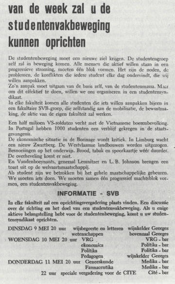 Er worden een hele reeks acties in het vooruitzicht gesteld. 3 maart, Leuven. Progressieve elementen in de Leuvense studentenbeweging richten de Studentenvakbeweging (SVB) op in de schoot van het KVHV. De naam en het idee komen uit Nederland overgewaaid, waar er sinds 1963 een SVB werkzaam is. SVB wil de studenten met vooruitstrevende ideeën groeperen in de strijd voor een 'totaal-democratie' tegen het kapitalistisch bestel. Het lijkt erop dat ze zich daarmee wel enigszins vergaloppeerd hebben: de grote massa blijkt in elk geval de orde-woorden van de Operatie Ultimatum niet altijd even stipt op te volgen. 9 maart, Leuven. De academische overheid roept Paul Goossens op het matje. Men stelt hem persoonlijk verantwoordelijk voor enkele baldadigheden tijdens de nacht van 7 op 8 maart en voor het bekladden van universiteitsgebouwen. Subsidies, die normaal bestemd zijn voor studentenvoorzieningen in de sociale sector moeten de herstellingskosten financieren. De sprekershoek in Alma II wordt opgedoekt omdat studenten er bij voorkeur de draak steken met de academische overheid. Deze maatregel ervaren de studenten als een beknotting van de vrije meningsuiting. 16 maart, Leuven. Onder impuls van het in 1962 opgerichte University Clearing Office for the Developing Countries (UCOD) zetten haast alle Leuvense studentenverenigingen een alternatieve vastenactie in: Operatie Restitutie. Het beoogde doel is de studenten ervan bewust te maken 'dat ontwikkelingssamenwerking niets te maken heeft met liefdadigheid, maar alles met wereldrechtvaardigheid, dat het een zaak is van restitutie, waartoe het Westen reeds lang de morele verplichting heeft! De tot 1972 jaarlijks terugkerende Operatie Restitutie zou bij de modale student de gevoeligheid voor de problematiek van de Derde Wereld — op zich een katholiek substraat — in niet geringe mate politiseren. 22 maart, Brussel. Een 200 studenten betogen tegen besnoeiingen in de onderwijsbegroting. 29 maart, Frankrijk. Studenten bezetten een meisjesverbijf op de campus van Nanterre. Ze eisen de afschaffing van het huishoudelijk reglement. Dit incident heeft het effect van een olievlek en aan de faculteiten van Nantes en Clermont-Ferrand doen zich min of meer ernstige incidenten voor. De studenten keren zich vooral tegen de preutse manier waarop de universitaire woonwijken worden beheerd. april 6 april, Duitsland. Studenten lokken te Berlijn hevige confrontaties uit met de ordehandhavers tijdens een grote manifestatie tegen het bezoek van de Amerikaanse vice-president Humphrey, tegen de Amerikaanse agressie in Vietnam en tegen de anti-studentencampagne van de krantenmagnaat Springer. Talrijke arrestaties vinden plaats. 12 april, Gent. 100 RUG-studenten betogen tegen de nieuwe studiebeurzenregeling. 12, 18 en 19 april, Leuven. In het raam van de Operatie Ultimatum houden telkens een 100-tal studenten een sleep-in op de stoep voor de Universiteitshal op de Oude Markt. 21 april, Griekenland. Een militaire staatsgreep onder leiding van kolonel Georgios Papadopoelos brengt het zogenaamde kolonelsregime aan de macht. 26 april, Leuven. Alle acties van de voorbije weken monden uit op een massale betoging van 4000 Vlaamse studenten. Operatie Ultimatum loopt ten einde zonder dat er van de eisen van de studenten iets is terecht gekomen. Een staking wordt aangezegd voor 18 mei. 28 april, Brussel. ULB-studenten protesteren andermaal tegen de besparingen in het onderwijs. mei 10 mei, Leuven. Binnen het KVHV begint er verzet te rijzen tegen de progressieve SVB-vleugel. Vooral in de discussies over de algemene staking van 18 mei treedt de groeiende onenigheid aan het licht. Het Faculteitenkonvent (FK), dat de talrijke faculteitskringen overkoepelt, distantieert zich van de voorgenomen actie en roept zich uit tot enig algemeen representatief orgaan van de Leuvense studenten. Zelf pakt het FK uit met een boycot van de Franstalige colleges en een telefoonactie, waarbij studenten liefst 's nachts Waalse professoren opbellen met de vraag hoe het met de expansieplannen staat. De staking van 18 mei valt na enig geredetwist in het water. 15 mei, Nederland. Provo heft zichzelf op in het Amsterdamse Vondelpark. Twee zomers lang domineerde Provo het Amsterdamse straatbeeld en via de televisie en de boulevardpers ook een beetje de internationale scène ('sien'). Toen ging het aan zichzelf ten onder. Zoals bij zovele anarchiserende bewegingen maakte zijn kracht ook zijn zwakte uit: een vaste structuur had de beweging zich nooit aangemeten, evenmin als ze zich ooit politiek precies had weten te definiëren. Vanaf de herfst van 1966 werd de organisatorische en ideologische samenhang steeds losser. De beweging teerde zichzelf ook uit met haar permanente provocatie die bergen energie verslond. Er traden vermoeidheidsverschijnselen op. De grootscheepse Vietnam-demonstraties werden al door studenten gedragen, SVB op kop, die weldra de rol van politieke voorhoede zouden overnemen. Op 15 mei 1967 hief Provo zichzelf op. De beweging stierf vervolgens een zachte dood in een Amsterdamse raadzetel, die ze met de verkiezingen van 1 juni 1966 in de wacht hadden gesleept en die onder meer Roei van Duyn tot 1971 zou warm houden. Door zijn deelname aan de gemeenteraadsverkiezingen was Provo in de val gelopen, constateerde Harry Mulisch niet zonder spijt in zijn provo-boek Bericht aan de rattenkoning in datzelfde jaar 1966. Provo zou nog even weer aan de oppervlakte komen met de Kabouters die in 1970 in Amsterdam de Oranje-Vrijstaat uitriepen. Inmiddels was Provo breed uitgedeind, van Rotterdam tot Maastricht, en over de rijksgrenzen tot in Londen toe, maar vooral in Vlaanderen waarmee een heuse Benelux-provofederatie tot stand kwam. Antwerpen gaf de toon aan met het blad Anar en Koen Calliauw, die er het Blote Voeten-plan lanceerde. Het was evenwel te Brussel dat in april 1966 op initiatief van Herman J. Claeys Vlaanderens eerste provo-blad verscheen, Revo, maar het was teveel een imitatie van het Amsterdam