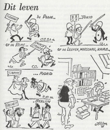 De maatschappelijke rol van de universiteit stond nog in het brandpunt van hun belangstelling. Voorts bonden ze de strijd aan met de bureaucratisering en werden de formeel-revolutionaire partijen over de hekel gehaald. Tegenwoordig is rooie Dany nog steeds overtuigd pacifist, commune-huisgenoot en lid van de Duitse groenen. Hij was mede-auteur van La révolte étudiante Les animateurs parlent. (1968) en interviewde in 1986 zijn internationale medestanders van toen in een televisiereeks Nous l'avons tant aimée, la révolution. 15 juni, België. Hugo Claus en Jean Jacques Lebel worden veroordeeld tot 10.000 frank boete en enkele maanden gevangenis omdat zij in het kader van het festival van de experimentele cinema van Knokke-Zoute, in december 1967, happenings 'tegen de goede zeden' hebben gepresenteerd. De overheid voelt zich niet zelden bedreigd door een ogenschijnlijk onschuldige actie als een happening en reageert krampachtig op dergelijke speldeprikken. 15 juni, Japan. Daartoe opgeroepen door de trotskistische Zenga-kuren, blokkeren 10.000 Japanse studenten het stadscentrum van Tokyo uit solidariteit met het studentenprotest in Frankrijk. Enkele dagen later wordt Tokyo opnieuw het toneel van studentendemonstraties. Voor- en tegenstanders van de aangekondigde universiteitshervormingen gaan elkaar te lijf. 16 juni, Frankrijk. De laatste bezetters worden met zachte hand uit de Sorbonne verdreven. 17 juni, Frankrijk. De stakingen in de automobiel- en staalindustrie lopen ten einde. Bij Renault hervatten de arbeiders het werk, twee dagen nadien volgen die van Peugeot. De Franse regering heeft forse loonsverhogingen en werktijdverkorting toegekend. 17 juni, België. Gaston Eyskens vormt meer dan twee maanden na de verkiezingen een CVP-PSC-BSP-regering. 28 juni, Frankrijk. Bij de vervroegde parlementsverkiezingen behalen de gaullisten een klinkende overwinning. De zwijgende meerderheid zet een domper op de meirevolte. 28 juni, Brussel. Het bezettingscomité beslist een punt te zetten achter de bezetting: door het tanend enthousiasme onder de studenten gelden de bezetters niet langer als representatief voor de hele contestatiebeweging aan de ULB Wel roept de volksvergadering op om de strijd voor democratisering op straat voort te zetten. Een kleine groep uiterst-linkse bezetters laat niet af. Naar verluidt met enige assistentie van buitenstaanders blijven ze de lokalen van de rechtsfaculteit bezetten ondanks de afkeurende reacties van vele studenten. Met de rector zijn intussen immers besprekingen aangeknoopt over hervormingen aan de universiteit. juli juli, Vaticaan. Paus Paulus VI wijst in zijn encycliek Humanae Vitae elk voorbehoedsmiddel voor geboortebeperking af. Dit is een bittere pil, die ook bij vele katholieken voor anti-roomse oprispingen zorgt. 6, 8 en 9 juli, Brussel. Op en rond de ULB-campus breken rellen uit tussen voor- en tegenstanders van een verdere bezetting. Studenten gooien de ruiten in van de gebouwen van de rechtsfaculteit, een niet mis te verstane hint voor de resterende bezetters. De politie komt tussenbeide. 11 juli, Brussel. Na een ultimatum van de academische overheid aan de bezettende studenten, sluit de politie de ULB-campus hermetisch af. Zonder noemenswaardige tegenstand slaagt ze er in om de 20 eenzame bezetters in te rekenen. In de loop van de nacht worden die weer vrij gelaten. 12 juli, Brussel. De contestatie aan de ULB is uitgedoofd, de rust weergekeerd. Hiervan maakt een delegatie van Vlaamse studenten en administratief personeel van de Brusselse universiteit gebruik om een bezoek te brengen aan de minister van nationale opvoeding, de socialist Pierre Vermeylen. Ze vragen de splitsing van de universiteit volgens taalgroep. De minister verzet zich vooralsnog tegen elke opdeling van de Brusselse universiteit. 17 juli, Leuven. De Belgische bisschoppen maken in een communiqué bekend dat ze zich uitgesproken hebben voor een totale overheveling van de Franstalige afdeling van de Leuvense universiteit naar Wallonië. De ene en onverdeelde universiteit van Leuven is geschiedenis geworden. augustus 21 augustus, Tsjechoslowakije. Troepen van het Warschau-pact (Sovjetunie, Polen, Oost-Duitsland, Hongarije en Bulgarije) vallen Tsjechoslowakije binnen en maken een einde aan de Praagse lente. Alexander Dubcek, de stuwende kracht achter de liberaliseringspolitiek wordt naar Moskou meegenomen. 21 augustus, Gent. Een 100-tal studenten betogen tegen de bemoeiingen van de Sovjetunie in Tsjechoslowakije. 24 augustus, Antwerpen. Ook te Antwerpen protesteren studenten op initiatief van de VNSU tegen het onderdrukken van de Praagse Lente. september 12 september, Brussel. Meer dan 200 Brusselse studenten betogen tegen de vertoning van The Green Barrets, een pro-amerikaanse Vietnamfilm. 20 september, Leuven. De academische raad van de Franstalige afdeling van de Leuvense universiteit maakt haar overhevelingsplan bekend: de Université Catholique de Louvain (UCL) verhuist naar Ottignies en Sint-Lambrechts-Woluwe. Het plan was enkele dagen voordien goedgekeurd door de bisschoppen. 24-28 september, Antwerpen. UFSIA organiseert een studieweek te Westende over de universitaire problemen. Met betrekking tot de grote maatschappelijke vraagstukken wordt radicale taal gesproken, maar aan de universiteit is een conflictmodel duidelijk uit den boze: constructieve samenwerking met de academische overheid biedt een alternatief voor contestatie. Een gezagscrisis kan worden bezworen in gemeenschappelijk overleg. Inmiddels dient de universiteit haar studenten wel politiek mondig te maken om zo een globale hervorming van de maatschappij mogelijk te maken. HORIZONTAAL OF VERTICAAL PLURALISME IN ANTWERPEN? - Inhoud De expansiewet van 1965, die voor de Antwerpse situatie geen definitieve oplossing geboden had, dreigde tussen de twee Antwerpse universitaire centra een lokale schooloorlog te ontketenen. De kern van de discussie bestond uit de concrete inhoud en vorm die aan het begrip pluralisme geg