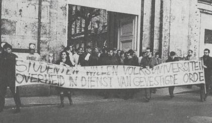 De samenwerking met het politieapparaat en het beruchte 'autoritarisme', tot nog toe alleen bekend uit de linkse strijdliteratuur, hebben de studenten aan den lijve ondervonden. Een en ander is zo scherp aan het licht getreden dat de porno-avond, de aanleiding van dit alles, al vlug van de spandoeken verdwijnt en plaats ruimt voor de nieuwe slogans uit de internationale studentencontestatie, die nu ook te Gent opgeld doen. Ze bieden alvast stof voor verdere actie. 11-13 maart, Antwerpen. Tijdens het VVS-congres over universitaire vernieuwing geraken de acties te Antwerpen in een stroomversnelling. Naast de slogan 'Voor een volwaardige universiteit te Antwerpen nu' verschijnen ook meer radicale slogans tegen de repressie, tegen de politiestaat en tegen de onderdrukking van de meningsuiting. Een democratische, pluralistische universiteit met een actief onderwijssysteem en een kritische maatschappelijke instelling wordt strijdobjectief nummer één. 14 maart, Gent. Na een geestdriftige volksvergadering klinkt het erg gedecideerd: 'Wij wensen geen lessen te volgen zolang onze gevangen kameraden dit niet kunnen. Wij wensen te werken aan de uitbouw van een niet-repressieve universiteit zolang de oude universiteit autoritair en repressief is'. De volksvergadering loopt uit op een betoging met 1500 studenten, die het Gentse stadscentrum doorkruisen. Ze roepen "t Is maar een begin, wij gaan door met de strijd', afgewisseld met 'Arbeidersstudenten, één front'. Kortom: zowel het élan als de juiste ideologische lijn zijn nog volop aanwezig. In de loop van de volgende dagen blijft het vergader- en betoogvirus voortwoekeren. Pamfletten dwarrelen over de stad en de Gentenaars krijgen muurkranten te lezen. Harde confrontaties met ordehandhavers blijven niet uit. 14 maart, Leuven. Enkele honderden Vlaamse en Waalse studenten betogen eensgezind voor waarborgen met betrekking tot de overheveling van de UCL naar Wallonië en voor de democratisering van het onderwijs. 17 maart, Antwerpen. Het Opsinjoorke wordt door studenten ontvoerd als gijzelaar in de actie voor een pluralistische universiteit. 19 maart, Gent. Een paar honderd studenten arriveren bij het krieken van de dag aan de fabriekspoorten van ACEC, Fabelta, Ebes, Texaco, Arbed, Sidac, de textielbedrijven en nog enkele andere fabrieken. Ze willen hun geestdrift voor de democratie overbrengen op de arbeiders. 19 maart, Leuven. VVS en haar Franstalige zusterorganisatie MUBEF organiseren samen een meeting voor Vlaamse en Waalse studenten. Er zijn ook delegaties uit het buitenland en van de Brusselse universiteit van de partij. Na een opkikker vanwege Paul Goossens begeven de studenten zich naar de woning van premier Eyskens om er te onderhandelen over de terugtrekking van de ordediensten uit de stad. Maar de rijkswacht kruist ze op hun pad en met traangas en waterkanonnen worden ze tegengehouden. De studenten werpen vervolgens barricaden op. Met 200 man slagen ze erin het college De Valk in te nemen; na nauwelijks één uur worden ze er evenwel door de ordehandhavers weer uitgehaald. 19 maart, Antwerpen. Enkele honderden Antwerpse studenten komen opnieuw op straat voor een pluralistische universiteit. 19 maart, Luik. Meer dan duizend Luikse studenten manifesteren voor het rectoraat voor meer democratie aan hun universiteit. 20 maart, Gent. Een vijf-puntenprogramma voor een alternatieve kritische universiteit komt uit de bus tijdens een volksvergadering in de Blandijn. De studenten willen het traditionele ex-cathedra-onderwijs vervangen door projectonderwijs in werkgroepen die aan het einde van het jaar worden geëvalueerd. Voorts moet de student zelf een pakket keuzevakken kunnen samenstellen. Om twee uur 's nacht valt de rijkswacht de Blandijn binnen. De 700 aanwezige studenten, nog steeds in vergadering bijeen, worden naar de rijkswachtkazerne gedraineerd waar ze de rest van de nacht doorbrengen. Rector Bouckaert laat de gebouwen aan de Blandijnberg sluiten en stuurt de studenten vervroegd met paasvakantie. 20 maart, Leuven. Zo'n 3000 Franstalige Leuvense studenten komen te Brussel bijeen voor een optocht van Sint-Lambrechts-Woluwe naar de Eeuwfeestpaleizen. Ze krijgen versterking van studentendelegaties van de faculteiten Notre-Dame de la Paix uit Namen en de universitaire faculteiten Saint-Louis uit Brussel. Waarborgen voor de overheveling, onderwijsvernieuwingen én kritiek op het politieapparaat staan in hun eisenprogramma voorop. 24 maart, Luik. Freddy Esther wordt de nieuwe voorzitter van de Union générale des Etudiants van Luik. Hij kondigt al onmiddellijk harde acties aan en hamert op samenwerking met de arbeiders die broodnodig is in de strijd voor een democratische samenleving. 25 maart, Gent. Nu de contestatie is afgelopen, worden de rekeningen vereffend. De raad van beheer van de Gentse rijksuniversiteit besluit alvast één student, Renaat Willockx, gewoon de laan uit te sturen en zeventien voor de universiteit werkende jobstudenten te ontslaan. Het beleid van rector Bouckaert tijdens de voorbije maartopstand krijgt de volle goedkeuring van de raad van beheer. 26 maart, Leuven. Als uitvloeisel van de jaarlijkse vastenactie Operatie Restitutie slaan verschillende universitaire werkgroepen te Leuven (UCOD, Ad lucem, Werkgroep Derde Wereld SVB, de Universitaire Parochie, Universitas, Werkgroep Derde Wereld KVHV), de handen in elkaar om samen met werkgroepen uit andere centra voor hoger onderwijs een Derde Wereld Beweging (DWB) op gang te brengen. Bij de Leuvense studenten is de internationale probleemgevoeligheid van lieverlede uitgelopen op een afwijzing van het eigen Westerse economisch model. De Derde Wereldbeweging belijdt dan ook uitdrukkelijk solidariteit met de bevrijdingsbewegingen in de derde wereld in combinatie met steun aan de arbeidersstrijd in eigen land. HET ZAAD DER MARTELAREN - Inhoud De problematiek van de ontwikkelingslanden heeft in hoge mate de'verlinksing' van jongvolwassen christenen beïnvloed. Die jongeren, gese