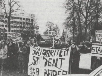 opmerkelijke aan dit evenement is dat germanisten, die tot voor kort hoogstens in Vlaamse of Groot-Nederlandse romantiek of erger Duitse Schwarmerei zwolgen, een bij uitstek politiek geladen debat organiseren met het marxisme en de organisatie van de economie als inzet, en dat dit toch nogal academische gebeuren ook nog een afgeladen aula geïnteresseerden trekt. Een en ander is tekenend voor de veralgemeende politisering van de student in het Rode Leuven tussen 1969 en 1975. 23 februari, Leuven. Het studentenprotest te Leuven tegen de legerhervormingsplannen van Vanden Boeynants bereikt een klimax met een optocht van een 2000 studenten. Behalve de afschaffing van het uitstel van legerdienst om studieredenen, wordt ook de NAVO gecontesteerd en de uitbreiding van de rijkswacht, 'als repressie-apparaat ter bescherming van de kapitalistische maatschappijstructuren'. Meer algemeen staat ook het Belgische NAVO-lidmaatschap ter discussie. Tot half maart komen nog geregeld studenten op straat om uit te halen tegen het verguisde 'plan Vanden Boeynants'. april 3 april, Gent. In de Gentse haven breekt een wilde staking onder de dokwerkers uit. Ze eisen loonsverhoging. De Intersyndicale van de Belgische Havens weigert deze staking te erkennen omdat ze in strijd is met de collectieve arbeidsovereenkomst van april 1972. Enkele dagen later breidt de staking zich ook uit naar de Antwerpse haven. De regering stelt de agitatie van kleine gauchistische groepjes als AMADA en RAL in deze acties aan de kaak. De staking zou voortduren tot 4 juni. mei 9 mei, Leuven. Een 200-tal studenten voeren actie uit solidariteit met de stakende dokwerkers. Te Leuven houdt de staking vooral de MLB bezig in de loop van de maand mei. Ook te Gent en Antwerpen vinden een maand lang meetings en betogingen plaats uit solidariteit met de dokwerkers. RAL en AMADA nemen er het voortouw. In Antwerpen laat ook SKAR, het Scholieren Anti-repressiekomitee van zich horen. juni juni, Leuven. De grootste Vlaamse cultuurvereniging, het katholieke Davidsfonds stoot zijn weerbarstige jongerentak, het Jong-Davidsfonds, af. Hierop fusioneert het Jong-Davidsfonds met het UCOD tot het Centrum voor Vorming en Actie (CVA). CVA wil door politiserend vormingswerk een democratisch basissocialisme uitbouwen. Her en der verschijnen er plaatselijke CVA-kernen die meestal ook een wereldwinkel openhouden. september 10 september, België. De regering keurt het legerhervormingsplan van minister Vanden Boeynants goed. Het protest op straat van scholieren en studenten lijkt vruchten te hebben afgeworpen : van de afschaffing van uitstel van legerdienst om studieredenen is immers in de hervormingen geen sprake meer. 11 september, Chili. Een militaire junta onder leiding van generaal Pinochet grijpt de macht. Bij de aanval op het presidenteel paleis komt president Allende om. Het terreurbewind, dat hierop volgt, wekt wereldwijd verontwaardiging. oktober 10 oktober, Leuven - Kortrijk. In Leuven mobiliseert de MLB 300 demonstranten tegen de militaire staatsgreep in Chili. In Kortrijk komen een 500-tal studenten om dezelfde reden op straat. 22 oktober, Antwerpen. De zogenaamde AMADA-dokters Kris Merckx en Michel Leyers worden door de correctionele rechtbank veroordeeld tot een geldboete van 780 frank. Ze waren voor de rechtbank gedaagd door de Orde van Geneesheren omdat ze een loopje hadden genomen met de honoraria die door de orde zijn vastgesteld. De 'rode artsen' willen echter volgens hun maoïstische overtuiging niet meedraaien in de tredmolen van het kapitalistisch systeem. Op het moment dat de rechter het vonnis uitspreekt, heft Kris Merckx uit volle borst de Internationale aan. Het publiek in de zaal, die vol studenten, sympathisanten en AMADA-aanhangers zit, valt in. Wanneer Merckx de kreet 'Fascisme neer, AMADA vooruit' de zaal inslingert, ontstaat een gevecht in regel met de ordediensten waarbij de AMADA-dokter een rijkswachtmajoor een paar rake klappen verkoopt. Voor dit incident krijgt Kris Merckx tien dagen hechtenis bij. Gedurende deze 10 dagen voeren de MLB en AMADA te Antwerpen solidariteitsacties. 29 oktober, Leuven. De academische raad van de KULeuven komt bijeen. De studenten in de Germaanse filologie hebben er de zaak Spies aanhangig gemaakt. De studenten keren zich tegen de benoeming van de bewuste Francois Spies tot lector aan de letterenfaculteit omdat hij als cultureel attaché bij de Zuidafrikaanse ambassade officieel het apartheidsregime vertegenwoordigt. De academische raad beslist nochtans dat Spies moet bijven: er wordt druk geschermd met de academische vrijheid en met de implicaties die een eventuele afzetting van een benoemd lid met zich meebrengt. november 6 november, Leuven. Ook de onderwijscommissie verwerpt de motie van de studenten tegen de heer Spies. Ondertussen boycotten de germanisten de colleges van de gewraakte lector, ondanks het feit dat vier studenten mordicus zijn lessen willen blijven volgen. De boycotters eisen een andere docent voor het vak Zuidafrikaanse taal- en letterkunde. 8 november, Leuven. Een 400-tal studenten betogen tegen de organisatie van Brasil Export, een handelsbeurs van Braziliaanse exportgoederen te Brussel. De studenten blijven hameren op de politieke situatie in Brazilië waar de rechtse generaal Medici een regelrechte dictatuur voert waarbij alle vormen van democratisch verzet in de kiem worden gesmoord. De meegedragen slogans verwijzen tevens naar het terreurbewind in Chili. Onder andere het CVA is erg actief in de anti-Brasil-Exportcam-pagne. 10 november, Brussel. Op deze druilerige zaterdagmiddag trotseren naar schatting 10.000 mensen de regen om hun ongenoegen te uiten over de organisatie van de handelsbeurs Brasil Export. Aan deze nationale protestmanifestatie wordt deelgenomen door talrijke studenten, die terzake meestal al opgewarmd zijn door acties aan hun eigen universiteit. Enkele slogans: 'Neen aan Brasil Export, neen aan de uitbreiding', 'Brazilië, Chili, Latijns-Amerika, eenzelfde vij