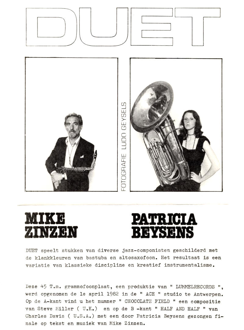 DUET speelt stukken van diverse jazz-componisten geschilderd met de klankkleuren van bastuba en altosaxofoon. Het resultaat is een variatie van klassieke discipline en kreatief instrumentalisme. Deze 45 T.m. grammofoonplaat, een produktie van "LUMMELRECORDS", werd opgenomen de 1e april 1982 in de "ACE" studio te Antwerpen. Op de A-kant vind u het nummer "CHOCOLATE FIELD" een compositie van Steve Miller (U.K) en op de B -kant "HALF AND HALF" van Charles Davis (U.S.A.) met een door Patricia Beysens gezongen finale op tekst en muziek van Mike Zinzen. A. Chocolate Field (Steve Miller) - na 11"