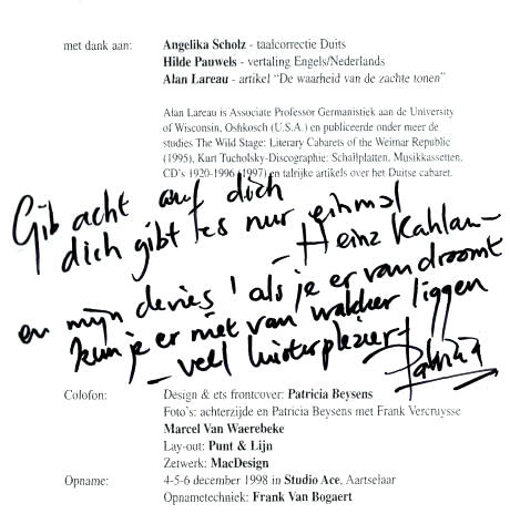 Alan Lareau: Het literaire lied houdt de maatschappij een spiegel voor, toont de wereld vanuit een nieuw perspectief. Het vanzelfsprekende verschijnt plots in een onthullend nieuw licht: groteske contradicties, onrechtvaardigheden, perversies, vervreemding. Ons moderne leven in het labyrint van de stad wordt een spiegelpaleis; we zien onszelf weerkaatst in verrassende vervormingen. De zangeres blikt in onze harten, onze dromen, onze verlangens en legt tevens onze diepste angsten bloot. De spiegel wordt een vergrootglas, een lens die de kleinste details onderzoekt om diepe waarheden aan het licht ie brengen. Het chanson is een kunst van subtiliteiten, van concentratie. Het is een volwaardig drama in drie beknopte strofen, waarin de zangeres louter met haar stem de personages, de sfeer, het verhaal tot leven wekt. Het vormt de meest wezenlijke versmelting van poëzie, muziek en acteerkunst. Patricia Beysens sluit aan bij de lange traditie van diseuses en cabaretzangeressen. In het Parijs van de negentiende eeuw gaf Yvette Guilbert met haar vocaal vrije, maar intense stijl de aanzet voor een nieuwe Kleinkunst, een kunst van miniaturen. De grote zangeressen van de twintigste eeuw tilden het lied op een hoger niveau: Blandine Ebinger, Trude Hesterberg, Kate Kühl - naast collega's builen het cabaret als de operettediva Fritzi Massary, Lotte Lenya met haar aangrijpende interpretaties van Brecht-Weill liederen, of Marlene Dietrich als mondaine vamp in de eerste geluidsfilms. Gisela May, een van de indrukwekkendste zingende actrices van onze tijd, deed na de Tweede Wereldoorlog in Berlijn het chanson opnieuw schitteren. Het artistieke geheim van deze vrouwen is de intelligentie waarmee ze zowel de woorden als de muziek doordringen. De luisteraar voelt onmiddellijk de overtuiging waarmee ze optreden. Deze zangeressen begrijpen en doorvoelen hun materiaal. Ze hebben tevens aandacht voor het eenvoudige en het schijnbaar onbeduidende. Ze hebben zowel een gevoel voor de zachte tonen en schaduwen als voor de felle kleuren en schrille tegenstellingen van het moderne leven. En haar vierde album laat Patricia Beysens blijken hoeveel ze van haar voorgangsters heeft geleerd, terwijl ze toch haar eigen stijl behoudt. Ze benadert haar repertoire als een zangeres met een buitengewone muzikale gevoeligheid. Daarom vormt ze een verfrissend alternatief tot de zingende actrices die het lied louter gebruiken om zichzelf voor het voetlicht te plaatsen. Patricia Beysens' chanson-kunst is er een van eerlijkheid, directheid en zelfs understatement. Maar onder de oppervlakte ligt een wereld van diepe gevoelens en inzichten. De schijnbare eenvoud maskeert verrassend complexe verbanden tussen tekst en muziek, de concentratie van deze intieme portretten voert ons naar diepten die we in zo'n nietig, banaal ding als een lied nooit hadden vermoed. Beysens bezit een speciaal talent om de emotie die schuilt in een woord, in een melodische frase naar boven te brengen. Ze kan fijngevoelig, rauw of sarcastisch koel zijn, met een vleugje doordringende jazz. Haar kien gevoel voor ritme en melodie gaat samen met een voorbeeldige dictie die de woorden tol leven wekt. Haar repertoire bestrijkt het hele scala van de chanson-traditie. Klassieke auteurs van het literaire cabaret - Tucholsky, Kästner en Morgenstern - vormen de historische basis, hoewel voornamelijk gebracht op moderne composities. Als een levendige herinnering aan het leed en de hoop van de jaren 1930 zijn twee liederen opgenomen van de auteur-componist Friedrich Hollaender, voor wie de vroege geluidsfilm nieuwe mogelijkheden opende. En uiteraard is er Bertolt Brecht. De exploratie van de vele facetten van het werk van deze grote toneelschrijver, tekstschrijver en satiricus van de kapitalistische excessen en onmenselijkheid is van cruciaal belang voor elke zangeres. Brecht zou in 1998 honderd jaar oud geworden zijn, maar zijn liederen op de oorspronkelijke muziek van Weill, Eisler en Dessau hebben niets van hun kracht verloren. In de klassieke liederen van de Weimar Republiek weerklinkt de eenzaamheid van de stad, de pijn van de verloren liefde, en de woede over moreel en politiek onrecht. Het zijn verhalen van de wanhopige zoektocht naar houvast in een zee van gezichten en veranderingen.