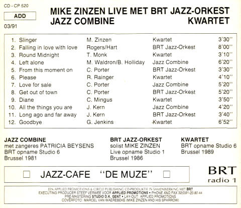 JAZZ COMBINE, BRT JAZZ-ORKEST, KWARTET ... drie facetten van altsaxofonist MIKE ZINZEN - Naar CD ZINZEN en de BRT, de BRT en MIKE; twee "monumenten", "instituten" op zich, twee verschillende werelden. Wie met beide "verschijnsels" enigszins vertrouwd is zal bij het ontwaren van zo'n combinatie wellicht even de wenkbrauwen tillen. Hoewel Mike zelden een muzikale uitdaging schuwt, getuige zijn experimenten met dans, poëzie, strijkers en theater, een samenwerking ZINZEN-BRT ligt daarom niet meteen voor de hand. Niettemin is diezelfde BRT hét sleutelwoord, dé gemeenschappelijke noemer van deze uitermate boeiende CD-compilatie geworden. Alle stukken zijn immers in opdracht van de BRT-omroep in zijn respectieve studio's uitgevoerd en opgenomen; de sessies overbruggen een periode van acht jaar. Memorabele momenten, fragmenten vastgelegde, geregistreerde, emotioneel gestructureerde tijd (een belangrijk element in Mikes filosofie), muzikale mozaïeken uit acht jaren van zijn creatieve, gelukkige leven. Ze laten de Antwerpse saxofonist in drie verschillende formaties horen; met "JAZZ COMBINE" als begeleider en solist van vocaliste-echtgenote PATRICIA BEYSENS, als stersolist "live" aan het werk met het "BRT JAZZ-ORKEST" en tenslotte als muzikaal leider van zijn Nederlandse "KWARTET" (dezelfde puike bezetting van de "My Romance" LP). Drie uiteenlopende projecten dus, waarvan bovenal de verrassende combinatie "ZINZEN en het BRT JAZZ-ORKEST", extra opvalt. Mike wou voor deze kardinale gelegenheid een wat men noemt klassieke "bigband sound". Geen onnodig complex gedoe, geen flitsende hoogstandjes noch modernistische klankkleuren. Gewoon leuke partituren waarop het voor een solist lekker spelen is. Voor de bewerking van de vier "standards" deed hij een beroep op pianist-arrangeur JAN VAN GIEL (Big-Band Geel), naar mijn mening een juiste keuze. De band o.l.v. BOB PORTER swingt heerlijk, de arrangementen zijn fris van de lever, niet cliché, de secties klinken hecht en ook ritmisch gebeurt er voldoende boeiends. Bovendien was er die opnamedag in "Studio 1" een talrijk en attent publiek present. De voor een jazzmusicus zo belangrijke sfeer is voelbaar, het applaus weerklinkt gul. MIKE ZINZEN speelt met een ontwapenend enthousiasme en blijft, zoals steeds, zichzelf. Hij geeft zich volledig, soleert met open geest, weet te ontroeren en vertelt hartstochtelijk zijn verhaal. En lijkt hij met het verstrijken der jaren wat milderen lyrischer geworden, alle opnamen dragen zonder uitzondering die unieke, onmiskenbare Zinzen-signatuur. De "live"-opnamen met MIKE ZINZEN zijn één der laatste openbare activiteiten van het "BRT JAZZ-ORKEST" gebleken. De band werd kort nadien wegens jammerlijke bezuinigingsmaatregelen, ontbonden en afgeschaft. Met de inhoud van dit kleine doosje heb je alvast een stukje geschiedenis in handen... Paul Turkry, januari 1991. EEN APPLIED PROMOTIONS & CIRCLE PÜBLISHING CD-PRODUKTIE IN SAMENWERKING MET BRT EXECUTING PRODUCER STEEF VERWEE VOOR APPLIED PROMOTIONS • PHONE AND FAX 32(0)91-20.80.44