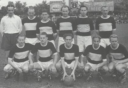 Met de ploeg van Excelsior We zaten met drieën op een kamer, maar de gar-diens kenden me, en mijn vrouw Maai bracht me elke dag eten. Na 3 weken hebben ze me laten gaan bij gebrek aan bewijzen. Ik zei dat ik uit schrik lopen gegaan was. Daarna ben ik bij hetzelfde ministerie nog 2,5 jaar arrondissementssecretaris voorTongeren-Maaseik geweest, met verantwoordelijkheid over 600 bedienden. Dat heeft geduurd tot de liquidatie van dat ministerie in '47. Was je verbitterd over het gebeuren met je broer ? Hij had het natuurlijk zelf een beetje gezocht. Maar ja, hoe geraakt ge ergens tussen ? De kameraden, het milieu... Ik heb in elk geval niet meegedaan aan de afrekeningen naderhand want daar zitten te dikwijls onschuldigen tussen. En degenen die woedend zijn, hebben dikwijls het minste recht van spreken. En al die zaken, ook bijvoorbeeld de misdadige Bende van de Kouseband, hebben de partizanen een slechte naam doen krijgen. Dat was spijtig, vooral voor de communistische kant. Zoals ook de CCC de partij enorm veel schade berokkend heeft. Aan het einde van de oorlog zijn wij met de hele compagnie met de geallieerden meegetrokken naar Maaseik. Na de bevrijding ben je wel actief gebleven in de communistische beweging. De communisten wilden natuurlijk iets overhouden van wat ze verworven hadden. Ze hadden een groot gebrek aan kaders. Mijn ouders waren socialisten want de Belgische Spoorwegen waren het brandpunt van de socialisten. Maar ik ben zelf ook niet opgevoed als communist. Ze hebben me gevraagd als sectieoverste en secretaris van de Communistische Partij. Vanaf '45 wilden ze ook meer sportmensen op de lijst. Ik was fel voor Stalin, want zijn misdaden waren ons natuurlijk onbekend. De geschiedenis wordt geschreven door de mensen aan de macht. Het is toch verschrikkelijk dat er zulke verschillen zijn : de enen zijn schatrijk, terwijl miljoenen anderen geen eten hebben. Ik ben altijd tegen onrecht geweest; ik heb altijd aan de kant van de zwakken gestaan. Vroeger geloofde ik dat het communisme in de revolutie dat zouden veranderen, de lectuur van Marx en Lenin versterkten dat. Maar nu twijfel ik. Ikben nog altijd lid van de partij, maar de laatste 2 jaar ben ik niet meer naar de vergaderingen geweest. Met dieren hebt ge ofwel vriendschap ofwel vijandschap. Bij mensen kan dat snel omslaan. Ik werd dikwijls misbruikt en heb nog weinig geloof in de mensen. Vroeger werd ik door de supporters dikwijls uitgejouwd wegens dat communisme, vooral bij een fout. De medespelers met wie ik pinten dronk, wisten wel beter. Je bent na de oorlog cafébaas geworden. In '47 kreeg ik een uitnodiging voor een belangrijke job op het Ministerie van Wederopbouw, maar dat hield een overplaatsing naar Brussel in. Mijn vrouw wilde niet verhuizen en ik heb dan 2 jaar disponibiliteit aangevraagd. In '48 zijn we dan op de Grote Markt café 'Excelsior' begonnen, waar nu de 'Drugstore' is. Ik deed ook in speelapparaten. Daarna hebben we op de Patat-tenmarkt 5 jaar café 'Centrum' uitgebaat. En dan tot '78 een zaak in de Kortstraat, weer met als naam 'Excelsior'. Ge wordt daar natuurlijk niet rijk van, maar cafébaas is een van de schoonste beroepen die er bestaan. Tenzij bij ziekte, zoals mijn vrouw, en ge moet een beroep doen op kennissen. En bij uw pensionering. Als ik aan de staat gebleven was, had ik een pensioen van 50 tot 60.000 frank, nu 18.000. Was er als speler, en later als trainer, iets te verdienen met het voetbal ? Bij Excelsior werden we altijd betaald : 350 frank per gewonnen match en bij derby's het dubbel. Tegen Sint-Truiden, Tongeren, Waterschei en Winterslag was het winnen of sterven. Er stonden 6 tot 7.000 supporters langs het terrein. Nu, dat geld was genoeg om 's zondags en 's maandags op café te gaan. Ik dronk in mijn eigen café geen pint, maar als ik uitging, kwam ik altijd zat thuis. Toen ik mijn vrijheid kreeg bij Excelsior, ben ik daar eerst 2 jaar speler-trainer geweest en daarna trainer. Het was moeilijk baas spelen over de mannen die ge zo goed kende. Daarna trainde ik 3 jaar in Bree en Schulen, 2 jaar in Herk, één jaar in Houthalen, 2 jaar in Zepperen, één jaar in Stevoort en Berbroek, 2 jaar in Beverst, één jaar in Bilzen en Hechtel, 2 jaar in Meerhout, één jaar inWesterlo en tenslotte 4 jaar bij den Haiwai.